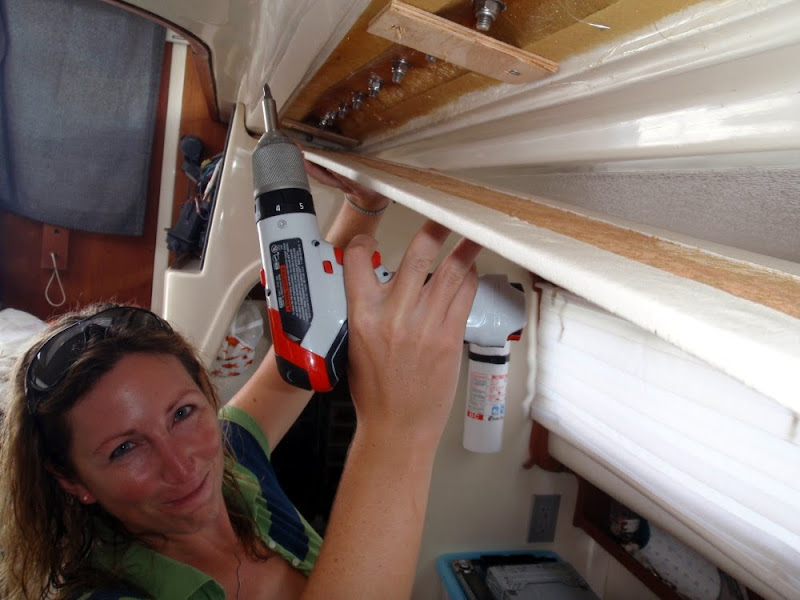 I think these are the nuts and bolts that go to the grabrail. 3Sum has some mighty fine sh*tty screws that immediately popped out when we grabbed the rail. Lisa and I have debated about how to fix it. I want to do it right, but we probably will do it Lisa's way - that is, no holes in the boat! My Mighty Putty patchwork from this summer didn't work so hot. The latenight infomercial convinced me that it was a good product and would do a great job in holding the screws in place.